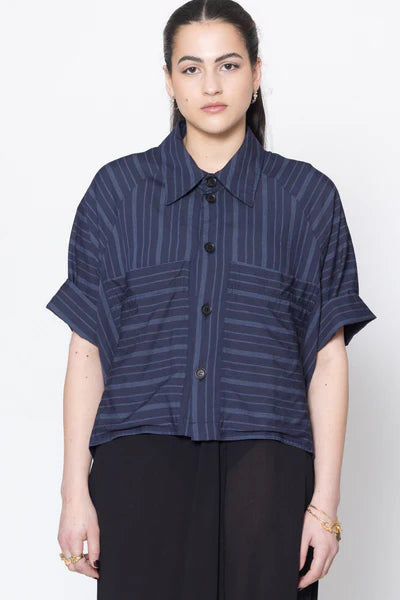 Short sleeve shirt in a viscose stripe shirting, designed for a relaxed to oversized fit. Raglan sleeve waist length shirt with generous fit collar, front patch pockets with pleat detail and front button up closure. Back has casing with tie to cinch in to adjust fit, this is a great crop style to wear as a shirt or jacket, worn with the Distort Dress.