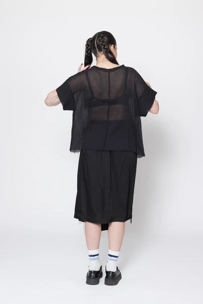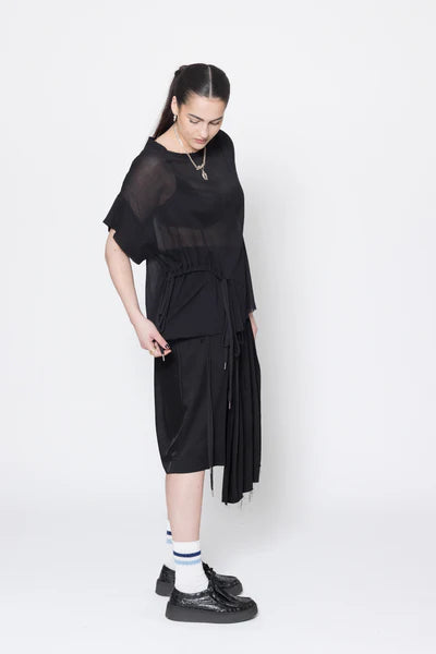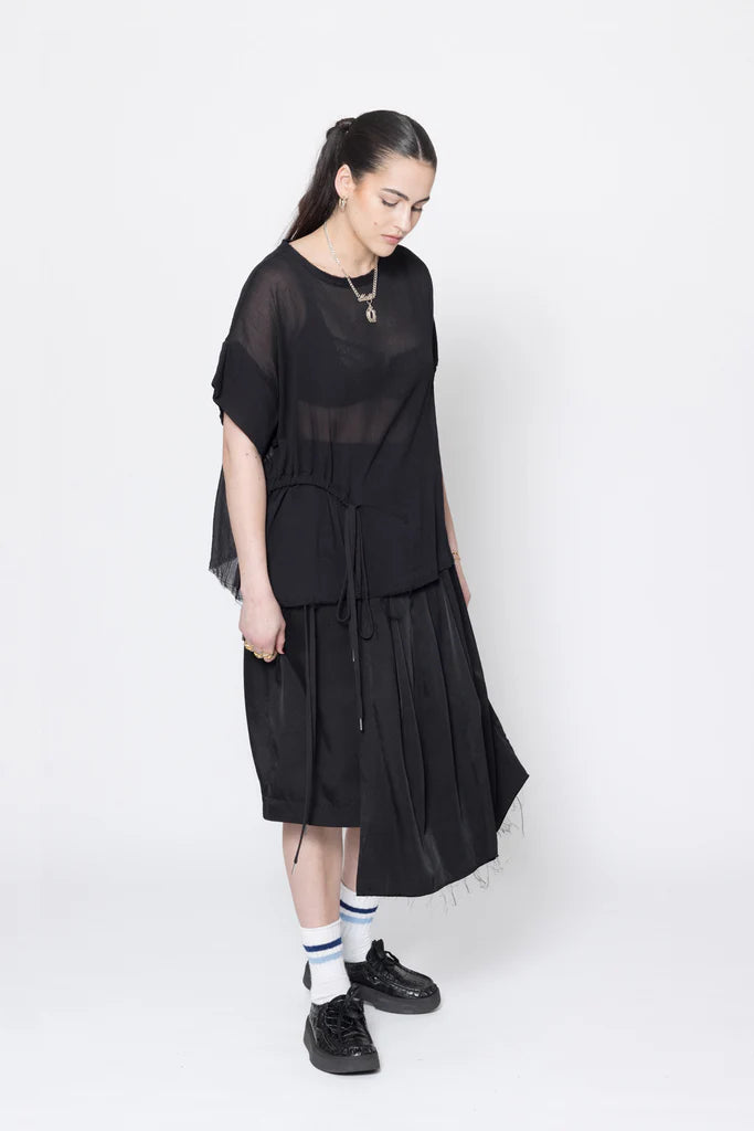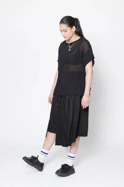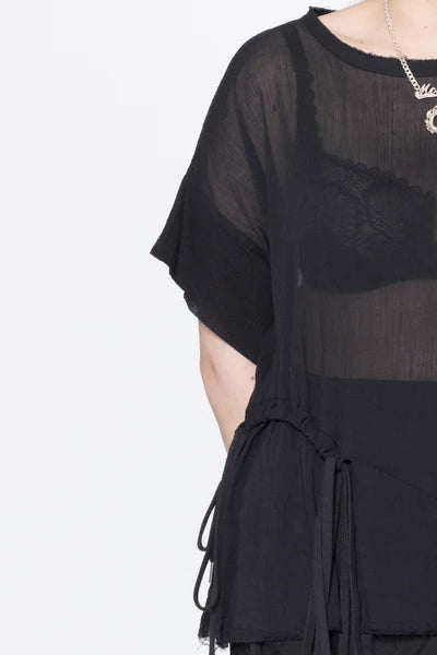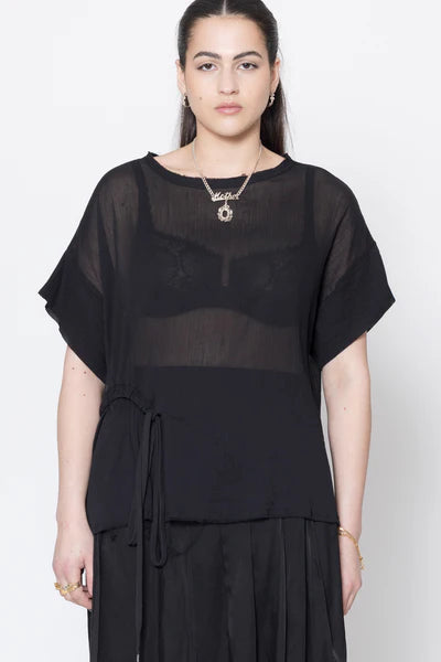 Short sleeve tee in sheer cotton crinkle chiffon, designed for an oversized fit. Featuring a round neck with raw neck trim, dropped shoulder with doubled sleeve, front curved casing with ties to cinch in or wear relaxed. This is the perfect summer tee, worn with the Reality Skirt.