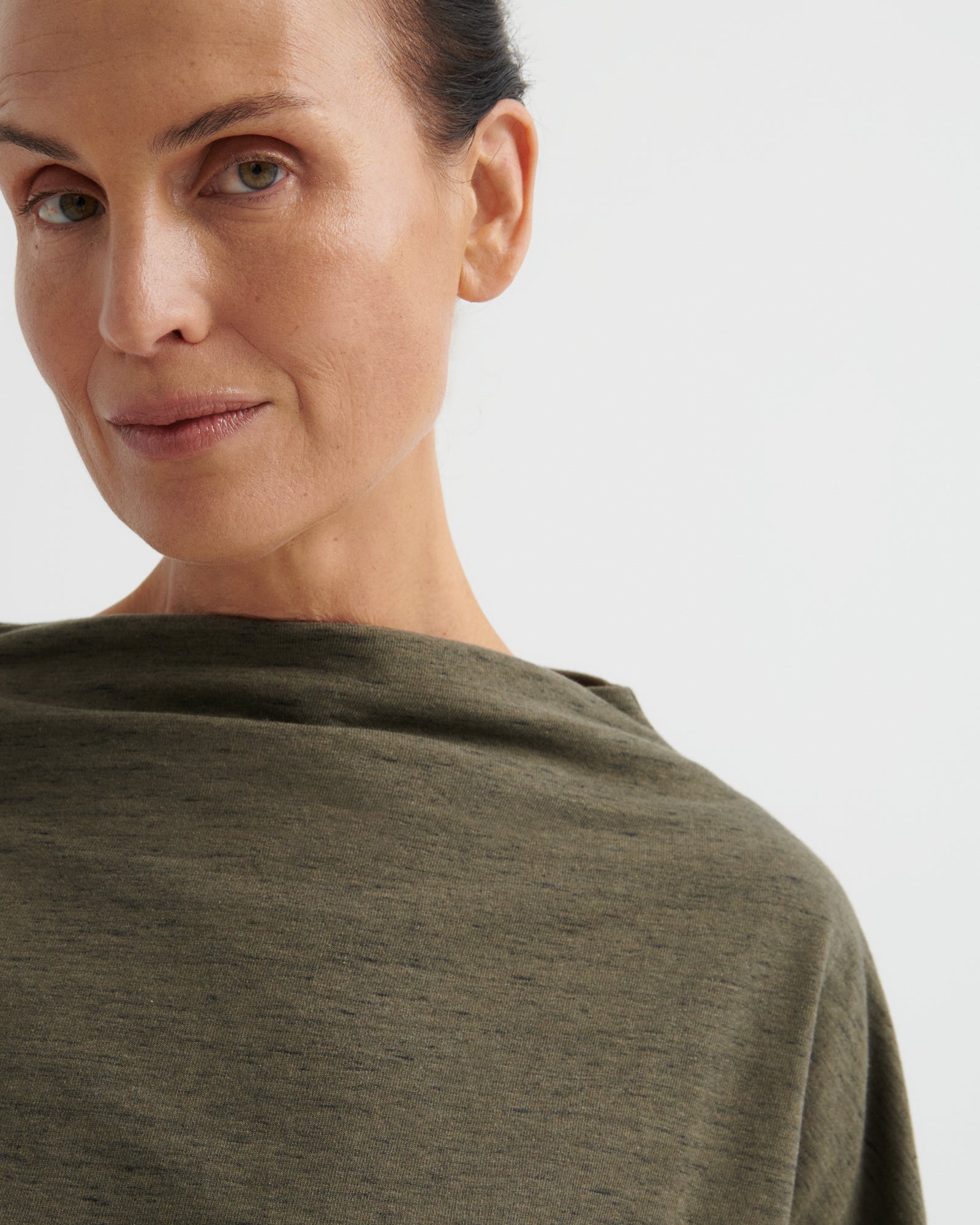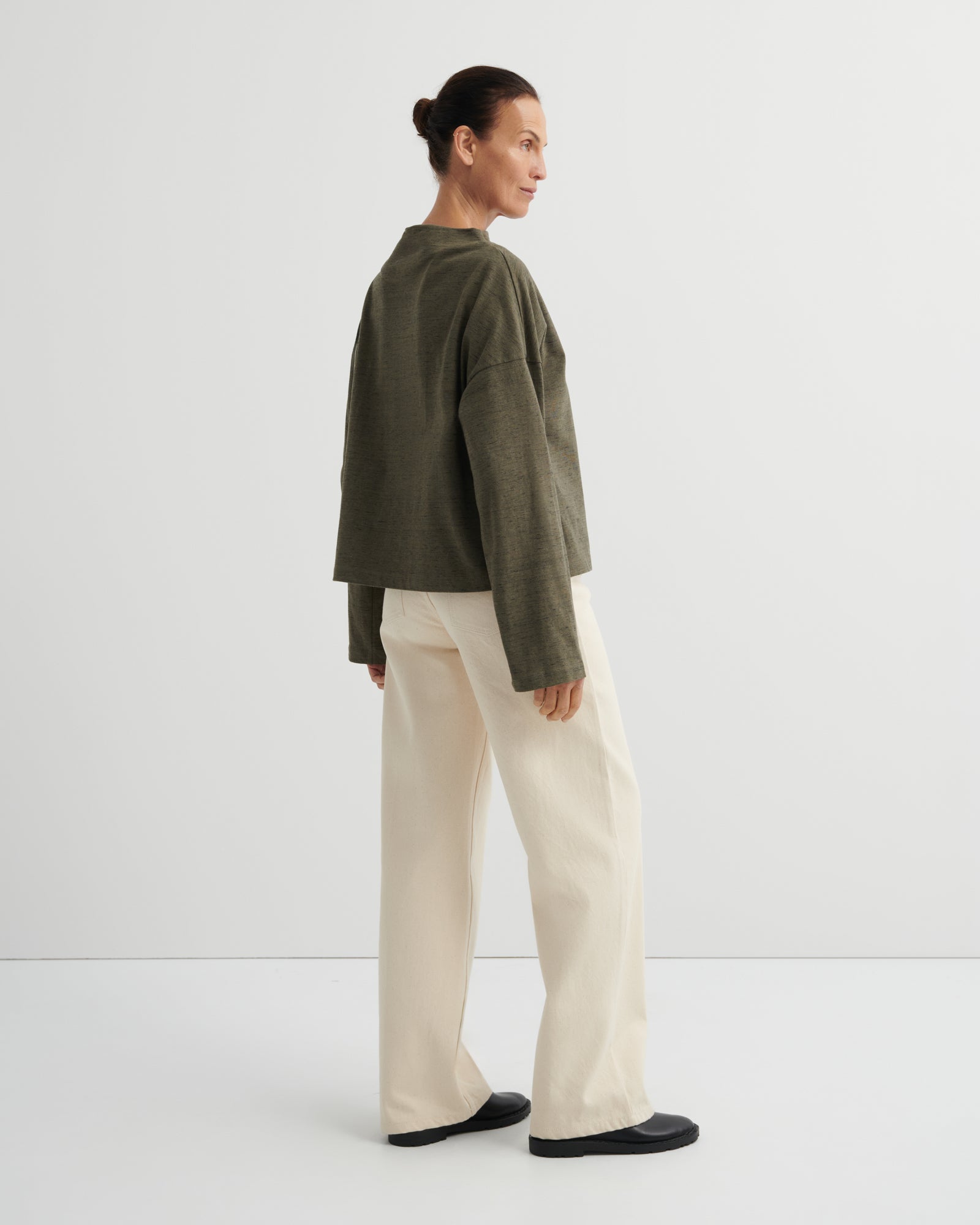 An oversized fit top finished with a wide funnel neckline. It has a drop shoulder with a wide sleeve and can be worn on its own or as a light layer. Made from organic cotton in a soft heavyweight jersey. All Fairtrade organic cotton. All plastic-free.