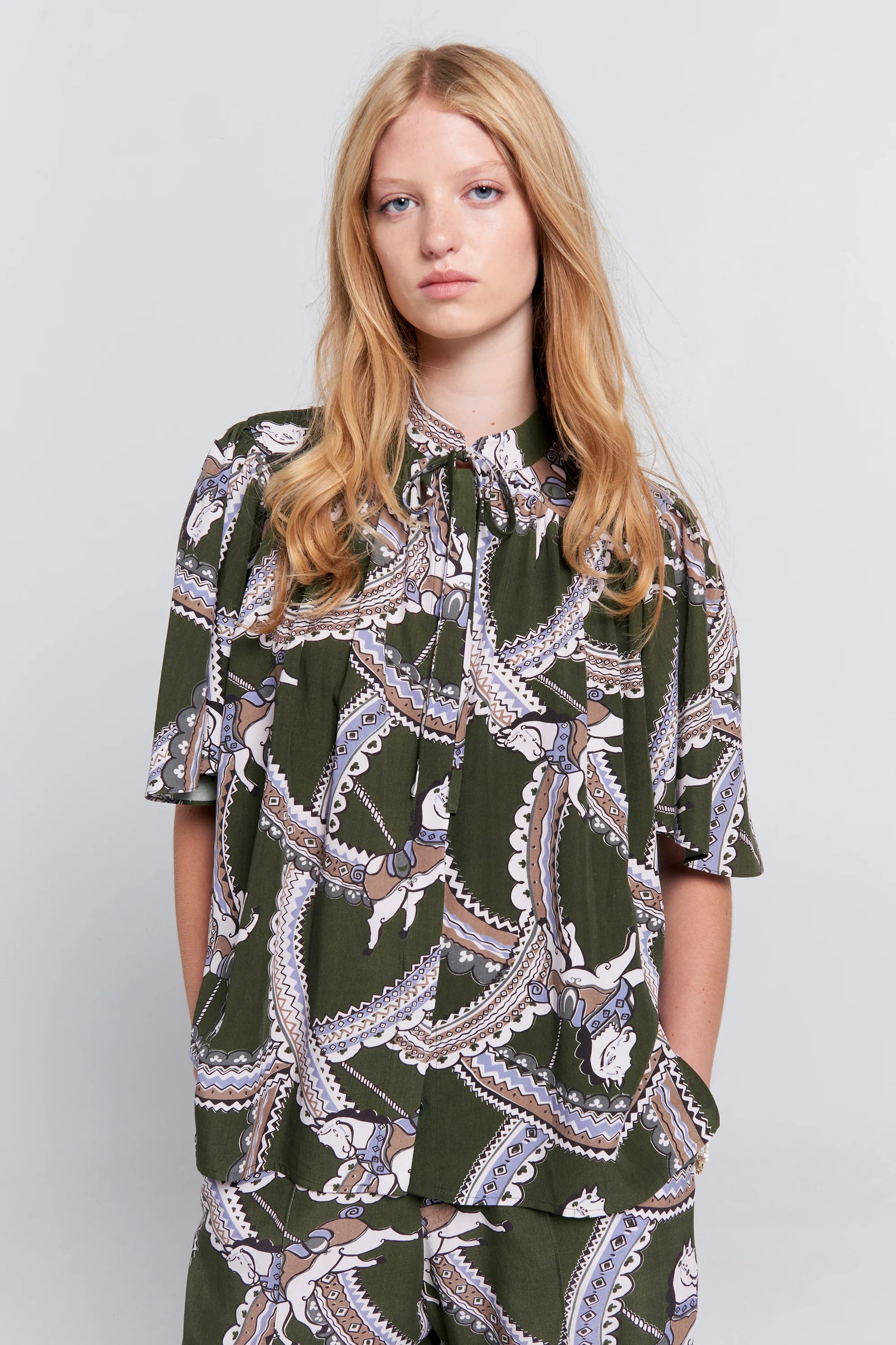 The Carousel Shirt in the signature Carousel Horse print reimagines a classic with a charming, playful twist. Featuring a chic bow neck closure and western-style yoke, gentle gathering adds a touch of glamour to its easy, versatile silhouette. Pair with jeans for an effortlessly cool vibe, or tailored trousers for a more refined finish.