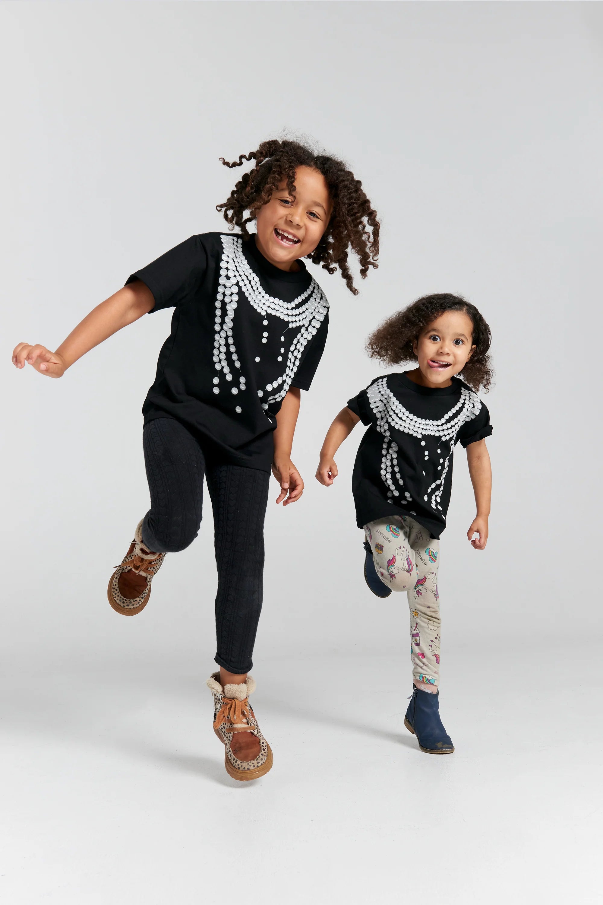 The signature Karen Walker Broken Pearls return—scaled down for mini wardrobes. First seen in Karen Walker’s 2000 collection, ‘Etiquette’, it plays with the idea of tradition undone. A graphic nod to dressing up, with no need to follow the rules. Available in kids’ sizes 2-8.