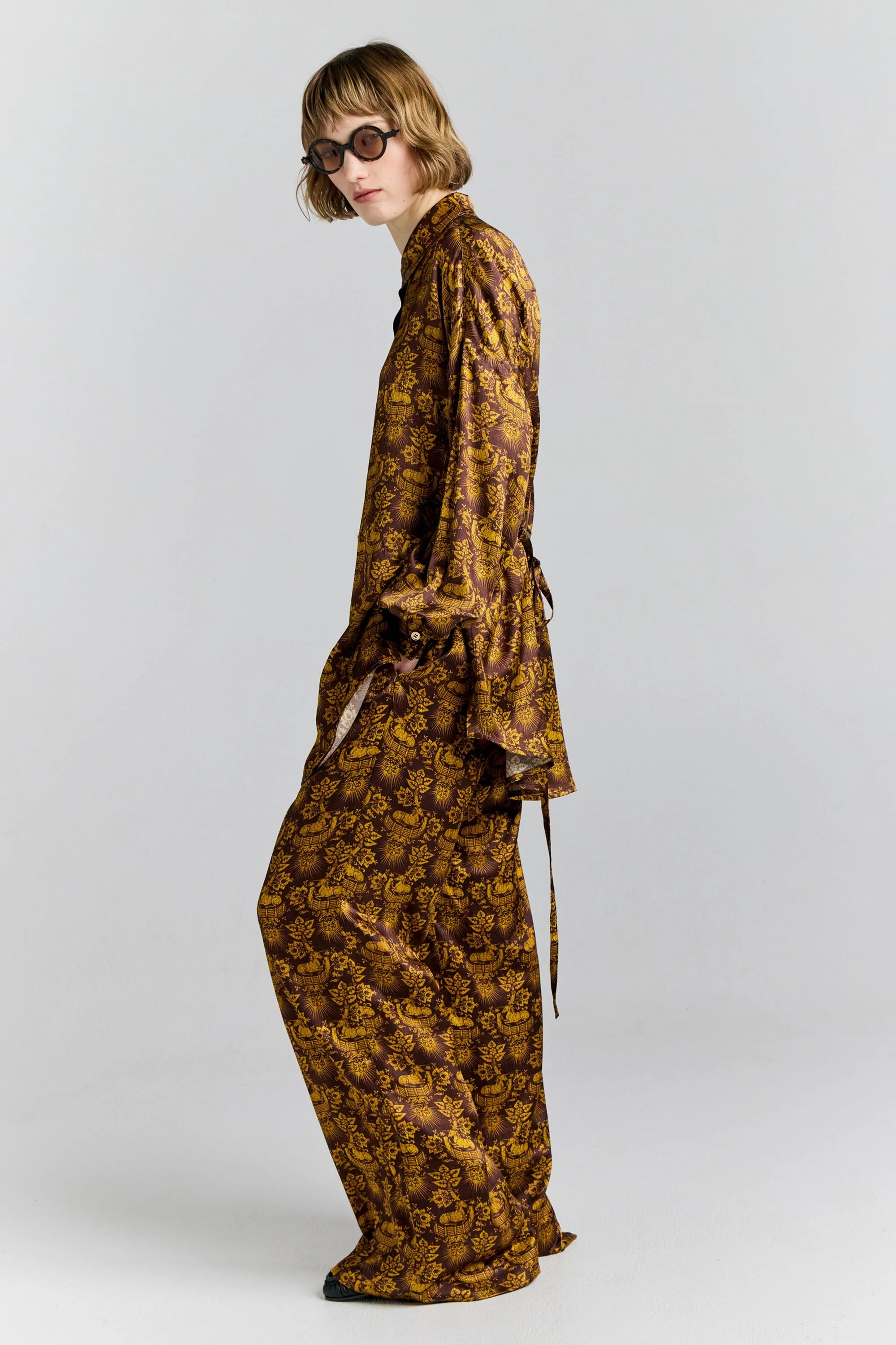 The Squall Shirt in unicorn crinkle satin features a striking unicorn motif in shimmering tones. Its relaxed silhouette softens tailored lines, while the chocolate-hued base and whimsical print inject both richness and individuality. Slightly longer in length, it can be styled with the matching satin tie at the waist – either wrapped around the front for a defined silhouette or tied at the back for a more relaxed, flowing look. Designed to carry you from daytime dressing to evening elegance with ease.
