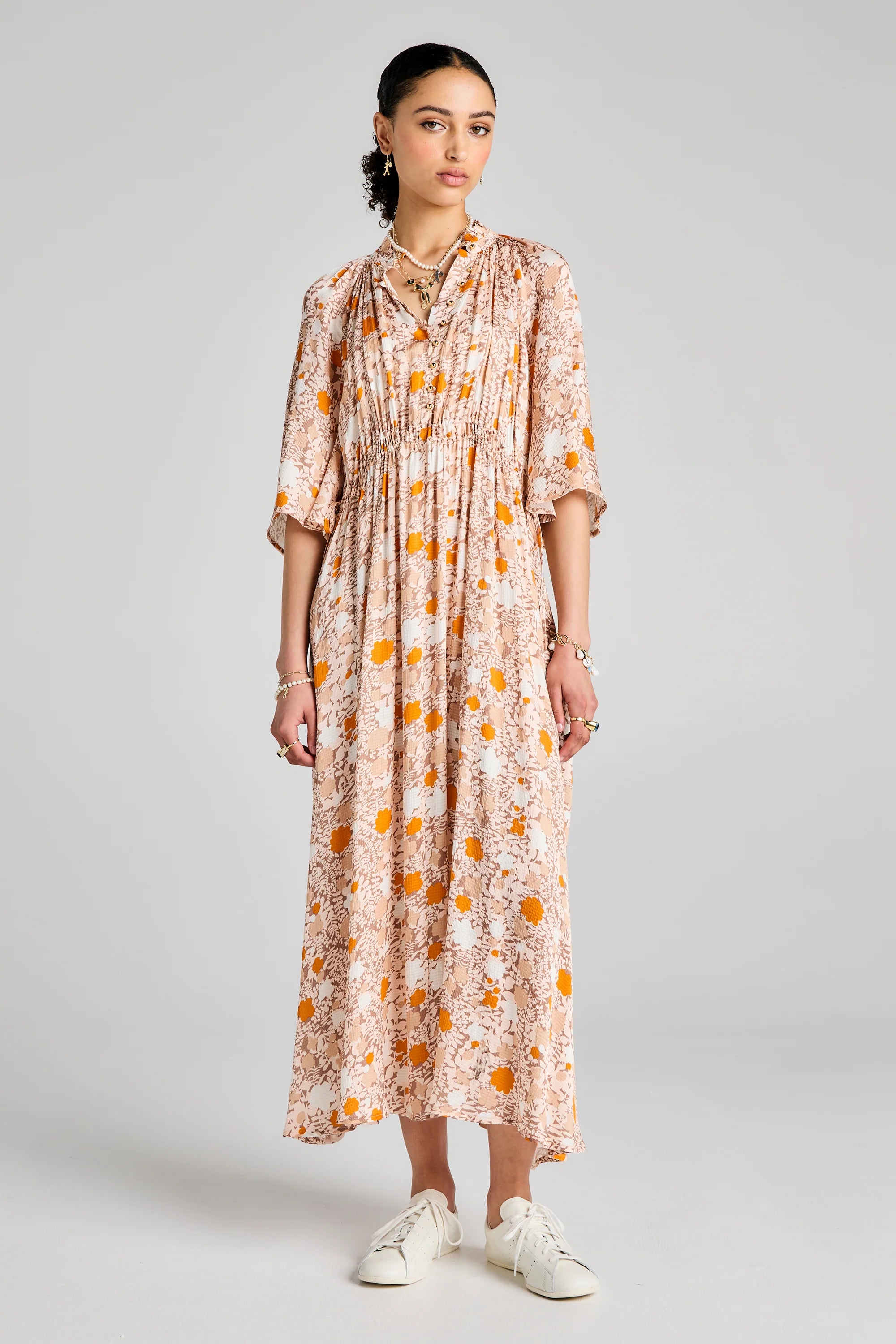 The Trinket Dress in Perfect Day Pink Multi is cut from a silk-viscose dobby blend, showcasing our Perfect Day floral print with a gentle lustre. Its gold-buttoned front and adjustable drawstrings detailing at the front and back create a relaxed, flattering silhouette, complemented by a fluid long midi skirt with discreet pockets. Balancing comfort and polish, this piece is ideal for both everyday wear and elevated occasions.