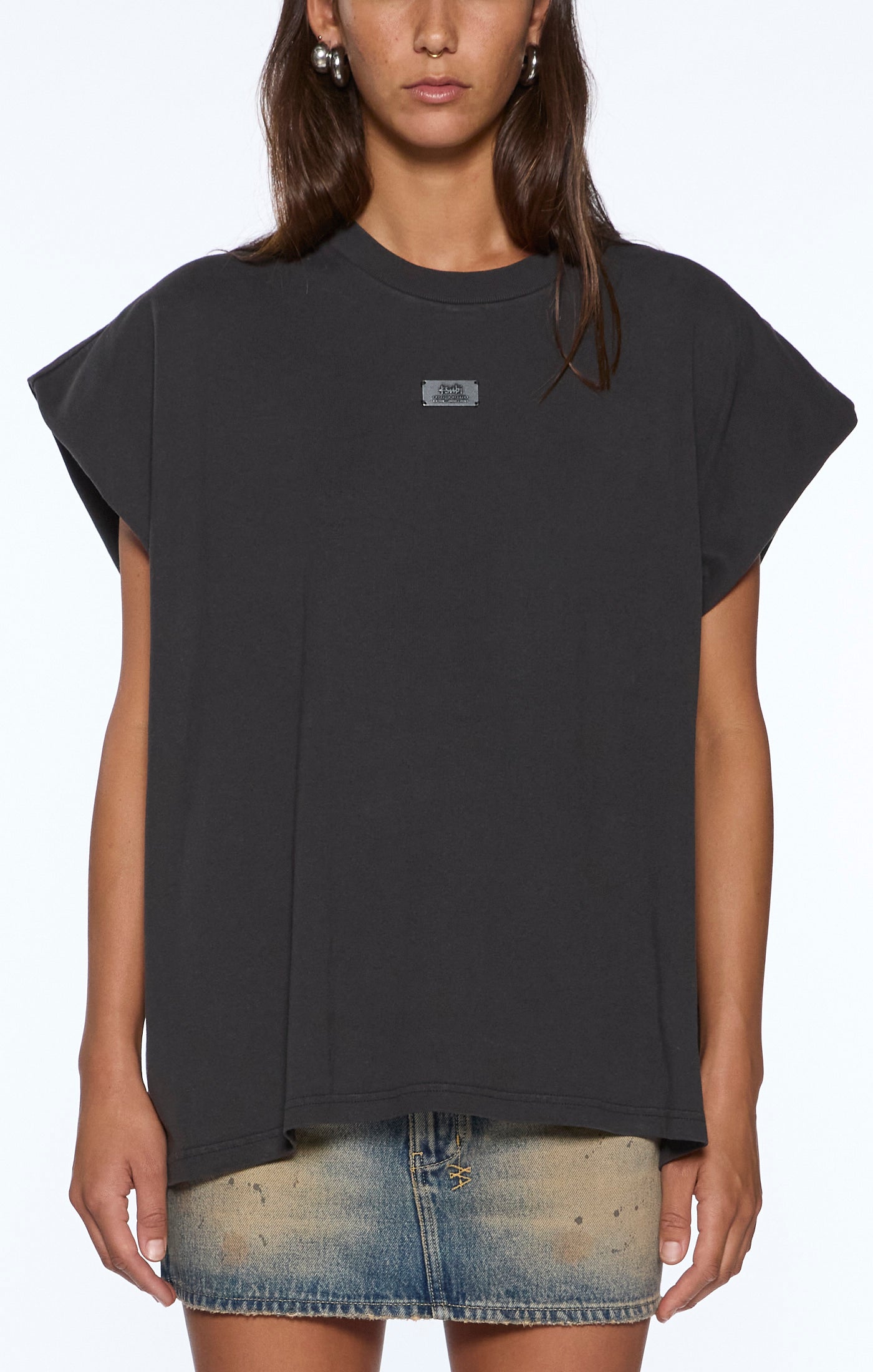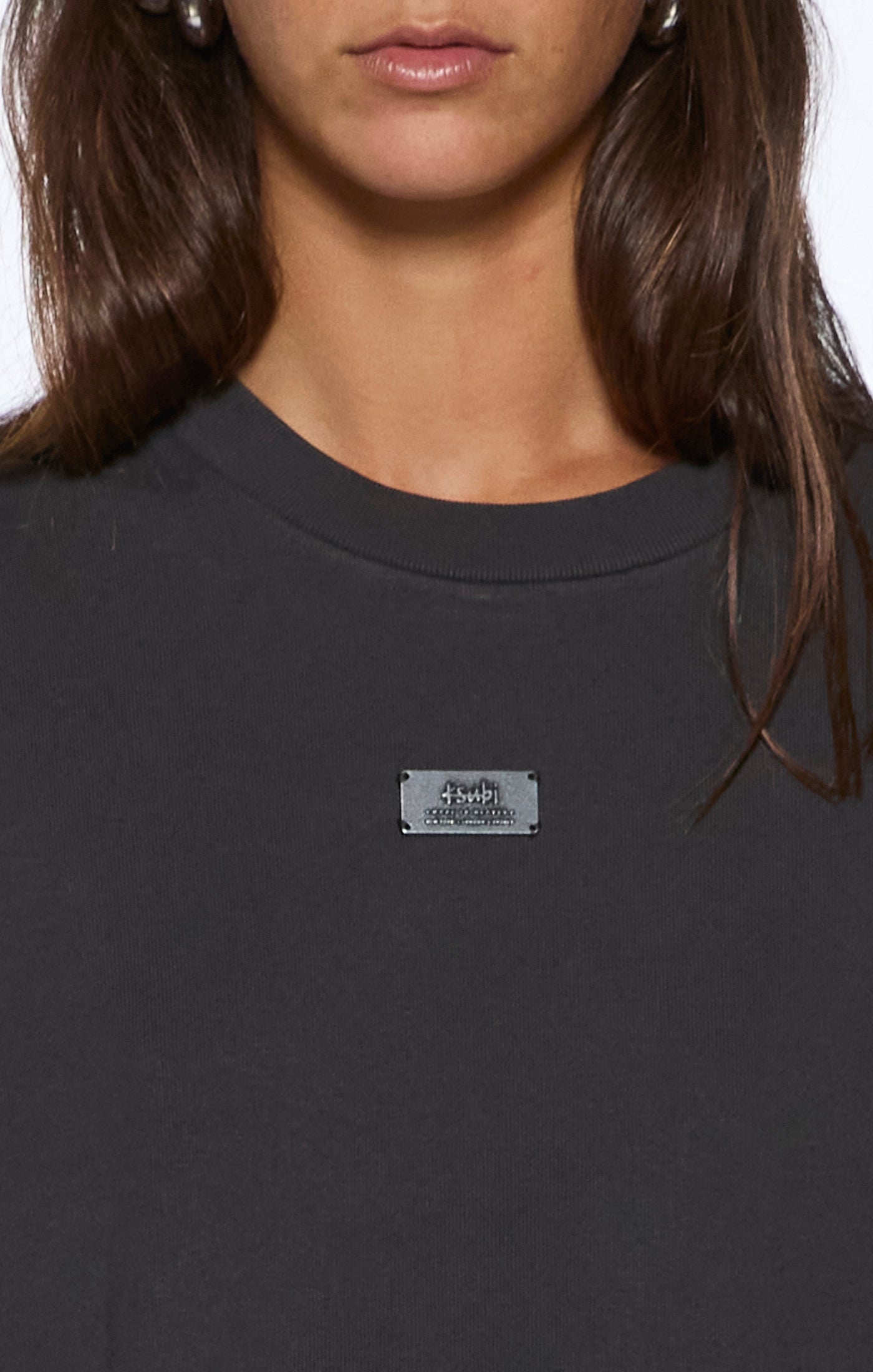 The Ksuper Tee is our boxiest and heaviest tee yet, crafted from premium (K)super heavyweight cotton jersey with a dry hand-feel in a 'Washed Black' colorway featuring a vintage, worn-in wash. Designed with a boxy silhouette, dropped shoulders, and cut-off cap sleeves, the heavyweight fabric creates a structured look at the shoulders. It's finished with an oxidized black Ksubi plaque and signature T-box embroidery.