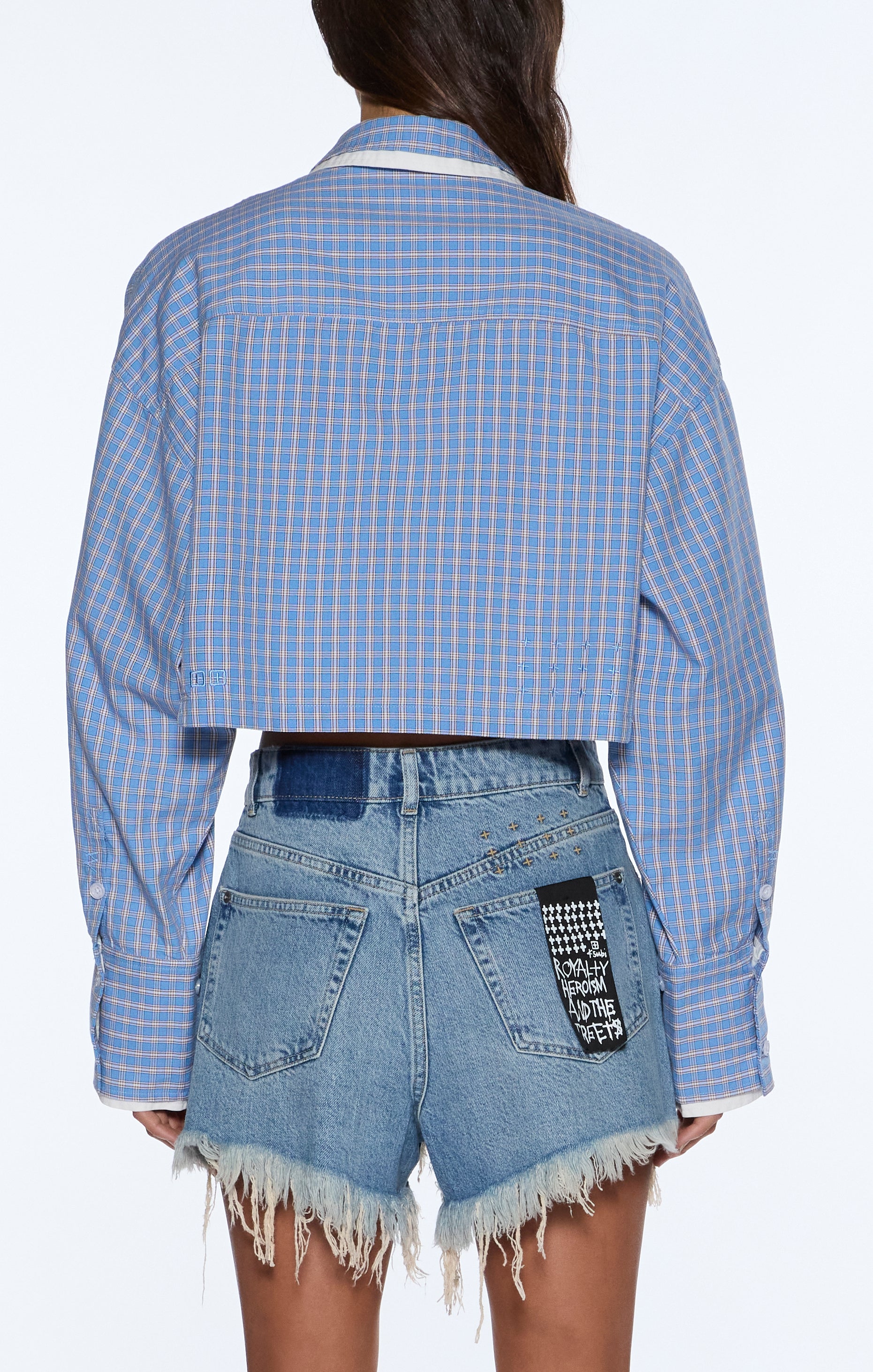 The Balter LS Shirt Blu Check is an oversized button-up shirt crafted from premium 100% cotton in a custom handloom plaid with a seasonal blue check. Designed with a cropped length, contrast double-layer collar and cuffs, panelled twin patch pockets, and exaggerated cuffs, it is finished with a 'Made in Heaven' woven label on the cuff and Ksubi's signature T-box embroidery for an elevated off-duty look.