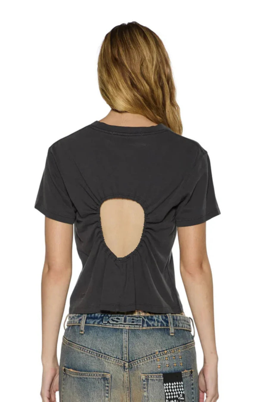 The Funny Bunny Shrunken Ss Tee Washed Black is a relaxed mini tee featuring a crew neck, short sleeves. Crafted from premium cotton jersey in a 'Washed Black' colorway, it showcases an exclusive Ksubi seasonal parody graphic inspired by the iconic 80s rock band 'Sonic Youth.' Design details include a circular cutout at the back with a ruched elastic bungee cord for adjustable styling, finished with signature T-box embroidery.