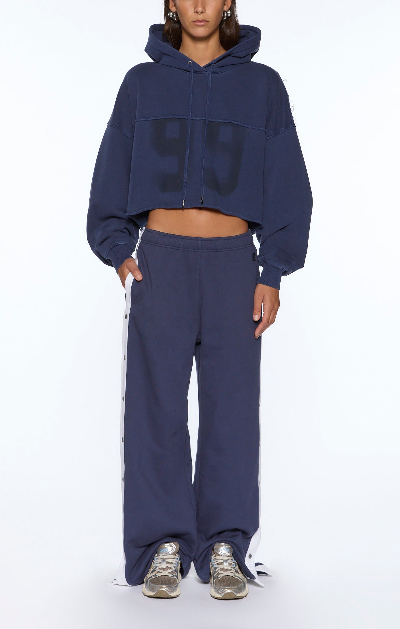 Oversized fit hoodie with dropped shoulder, long sleeve and cropped length. Featuring rib cuffs and raw edge yoke seam detail. Featuring exclusive Ksubi '99' ghost patch and embroidered outline on front. Made from a premium loopback cotton fleece in 'Ink Blue' colourway. Features Ksubi 'SOTT' label on wearer's left sleeve and T-box embroidery on back.