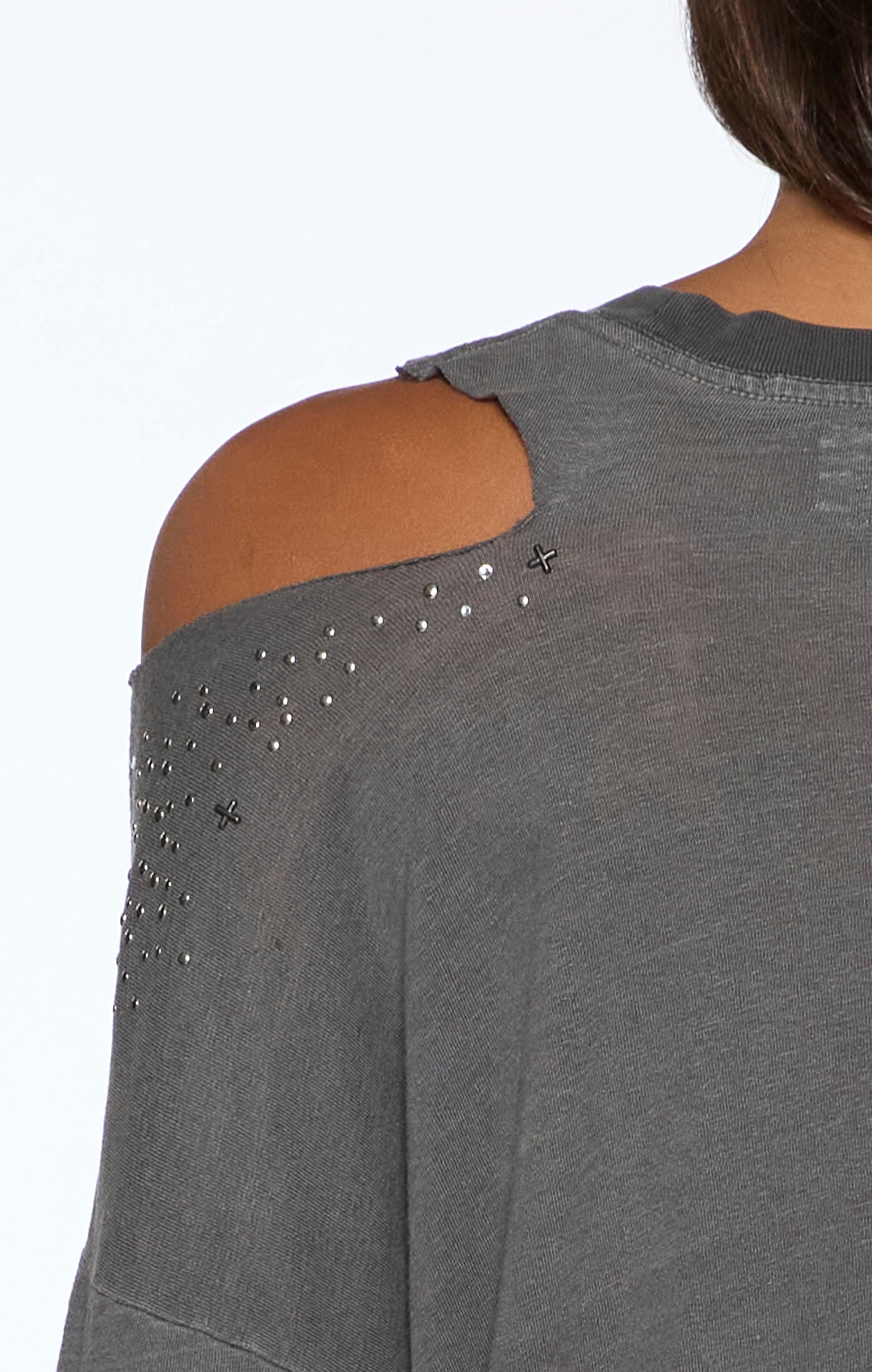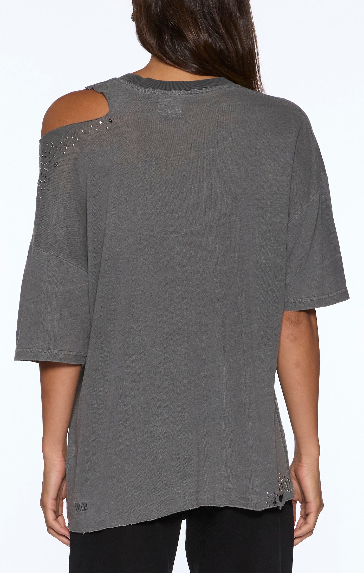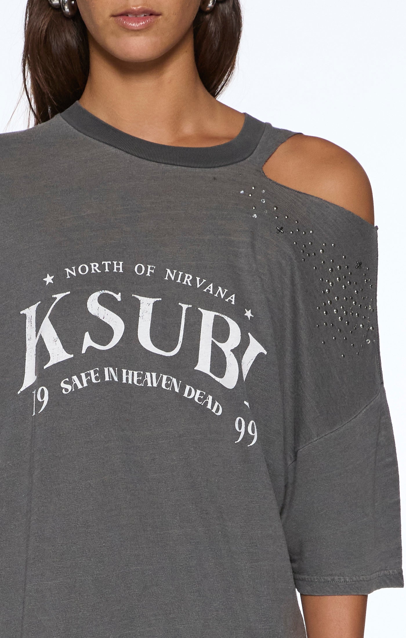 Relaxed-fit t-shirt features a crew neck and short sleeves, crafted from a semi-sheer slub jersey in a Charcoal colorway. Designed with decon slashes at the neckline and back hem, it's finished with densely scattered diamant's, studs, and signature Ksubi cross embellishments for a bold finish. A diffused seasonal Ksubi graphic on the front, with subtle knicking throughout adds a worn-in feel. Completed with Ksubi T-box branding.