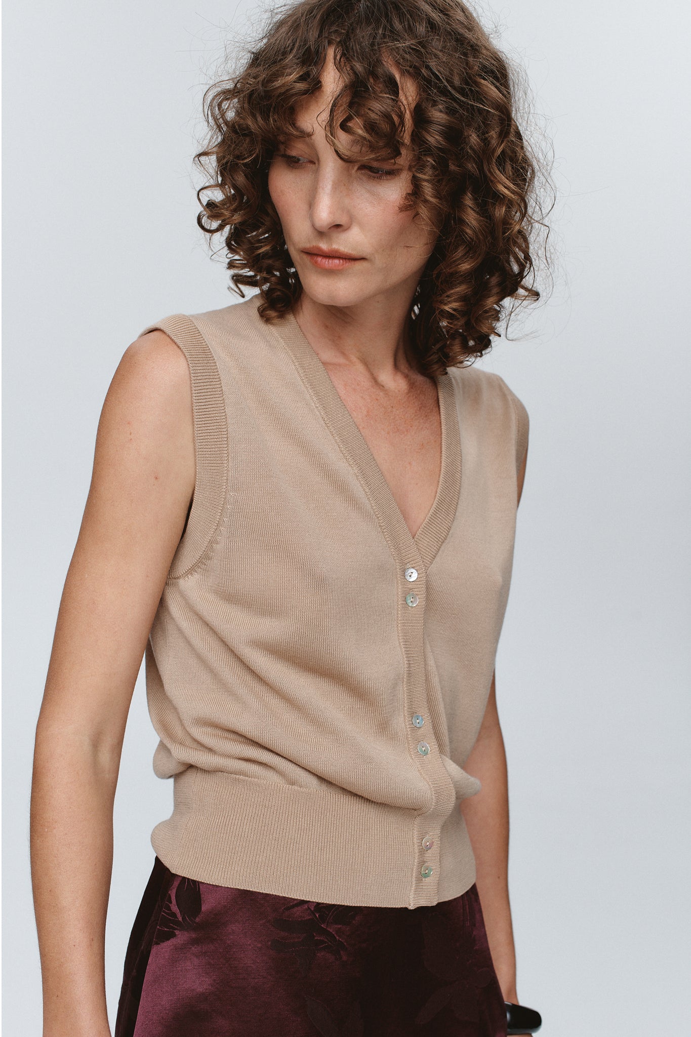 A sleeveless vest constructed from a fine-gauge knit. Features a deep V-neckline and center front placket with contrast shell buttons arranged in a paired configuration. Finished with a wide ribbed hem for structural integrity and subtle textural contrast.