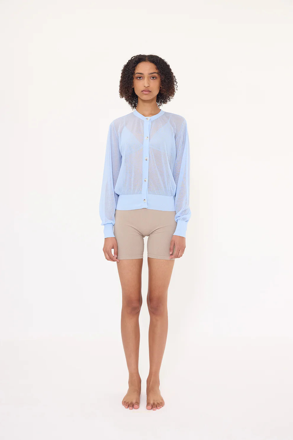 The Lillian Cardi is a sheer summer layer, knitted from a fine cotton-rich yarn with a soft, lightweight hand feel. This classic cardigan shape features a button-through front with ribbed neck, cuffs, and hem.